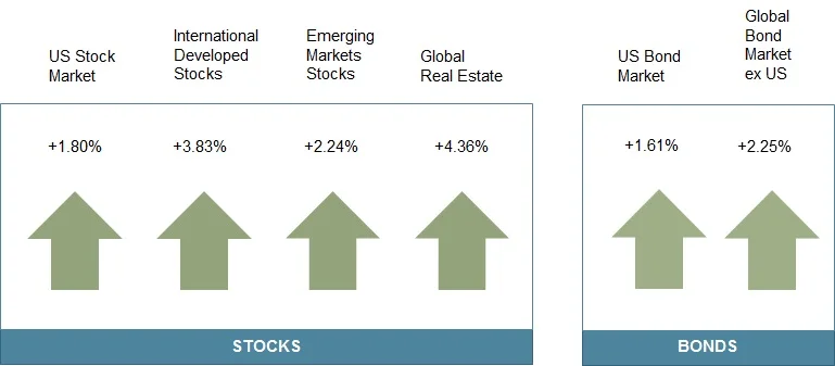 Past performance is not a guarantee of future results. Indices are not available for direct investment. Index performance does not reflect the expenses associated with the management of an actual portfolio. Market segment (index representation) as follows: US Stock Market (Russell 3000 Index), International Developed Stocks (MSCI World ex USA Index [net div.]), Emerging Markets (MSCI Emerging Markets Index [net div.]), Global Real Estate (S&P Global REIT Index), US Bond Market (Barclays US Aggregate Bond Index), and Global Bond ex US Market (Citigroup WGBI ex USA 1−30 Years [Hedged to USD]). The S&P data are provided by Standard & Poor's Index Services Group. Russell data © Russell Investment Group 1995–2015, all rights reserved. MSCI data © MSCI 2015, all rights reserved. Barclays data provided by Barclays Bank PLC. Citigroup bond indices © 2014 by Citigroup.