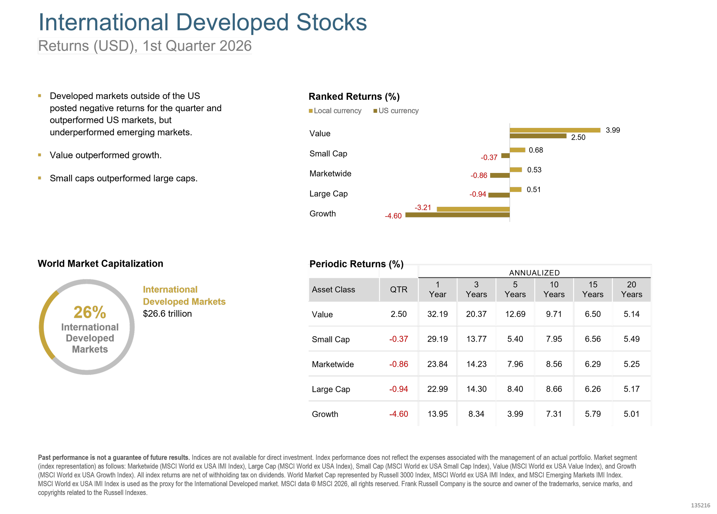 International developed markets outperformed the US in Q1 2026, with value stocks leading and growth stocks lagging.