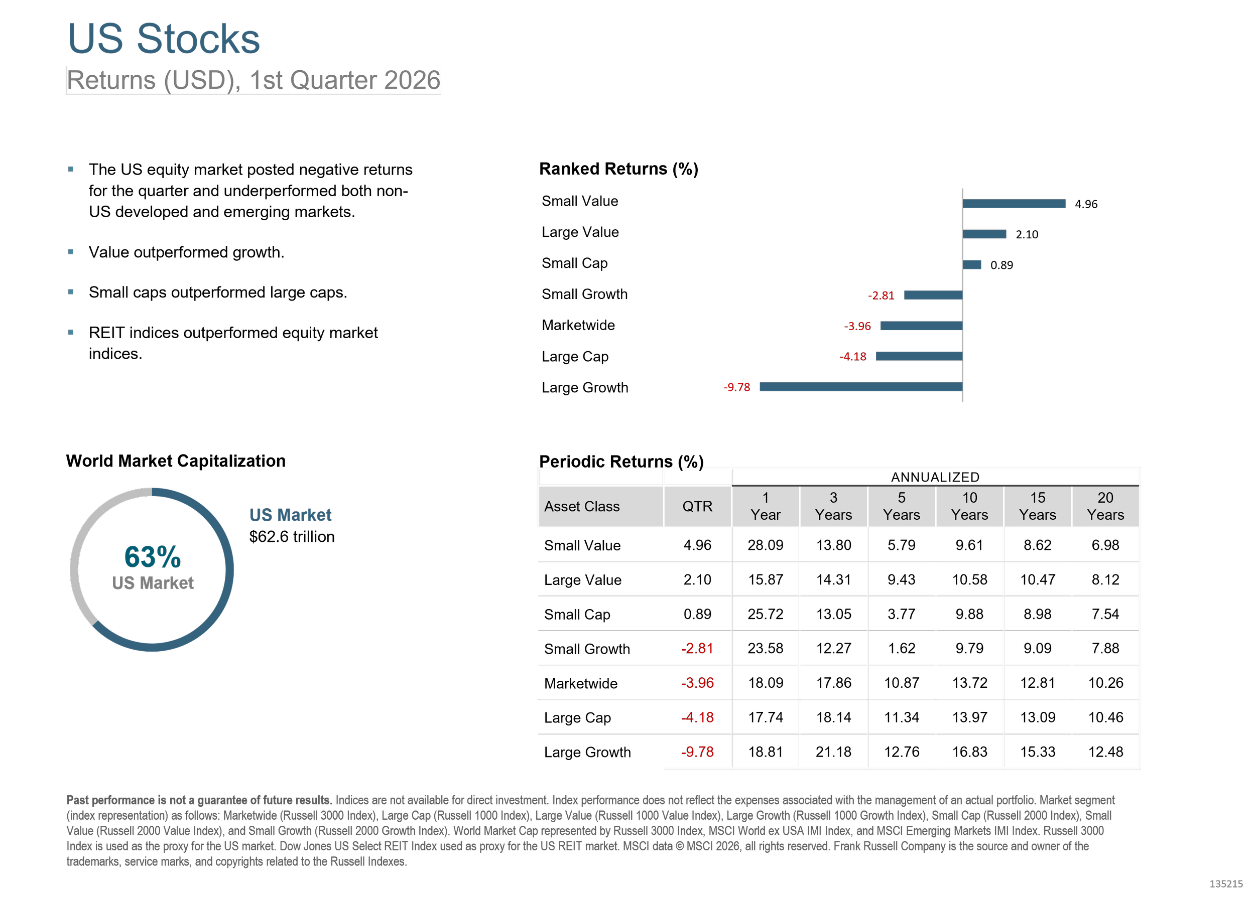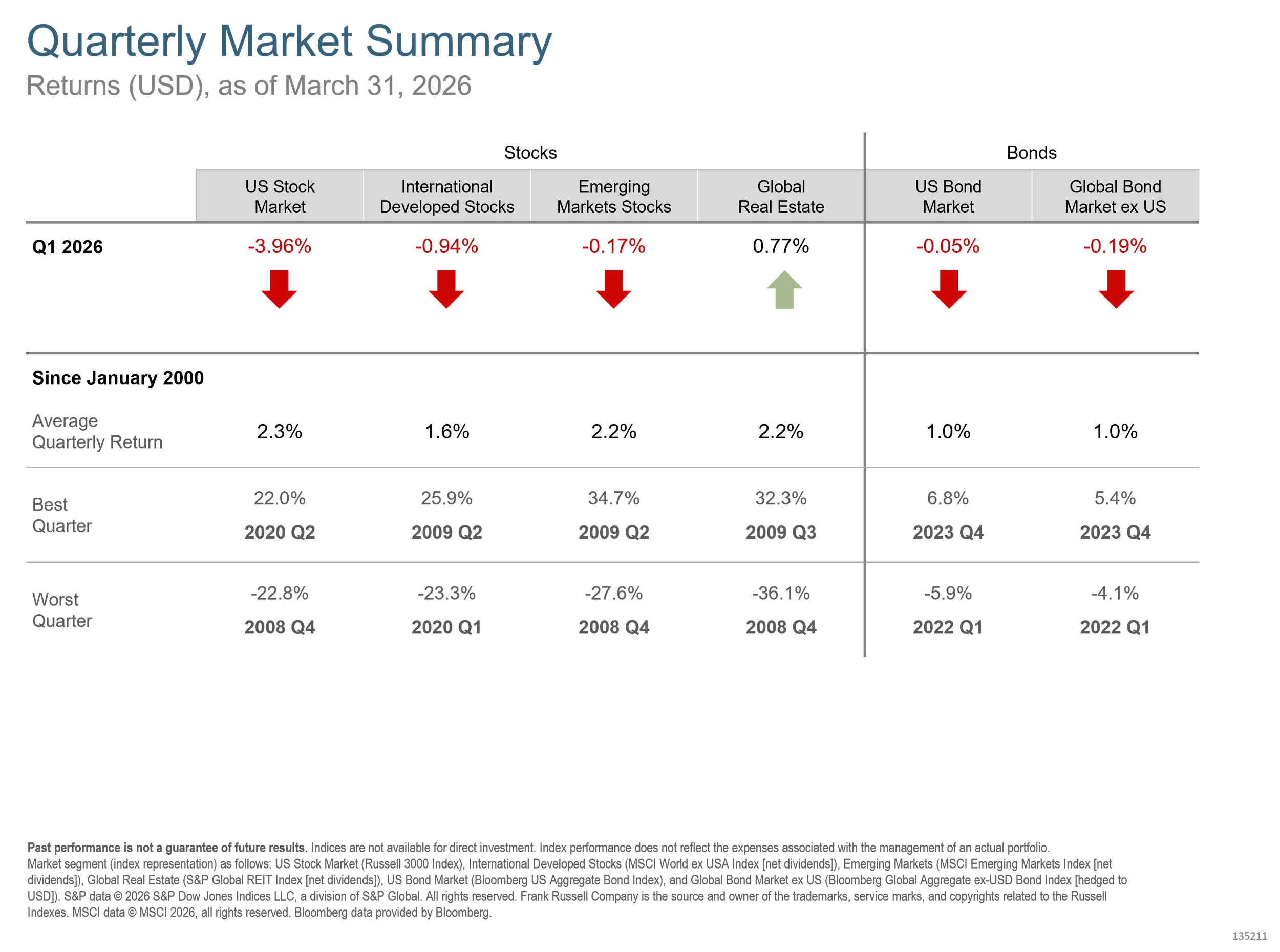 Q1 2026 market summary. US stocks declined 3.96% in the quarter, while international developed stocks fell 0.94%, emerging markets slipped 0.17%, global real estate gained 0.77%, and the US bond market was down 0.05%.