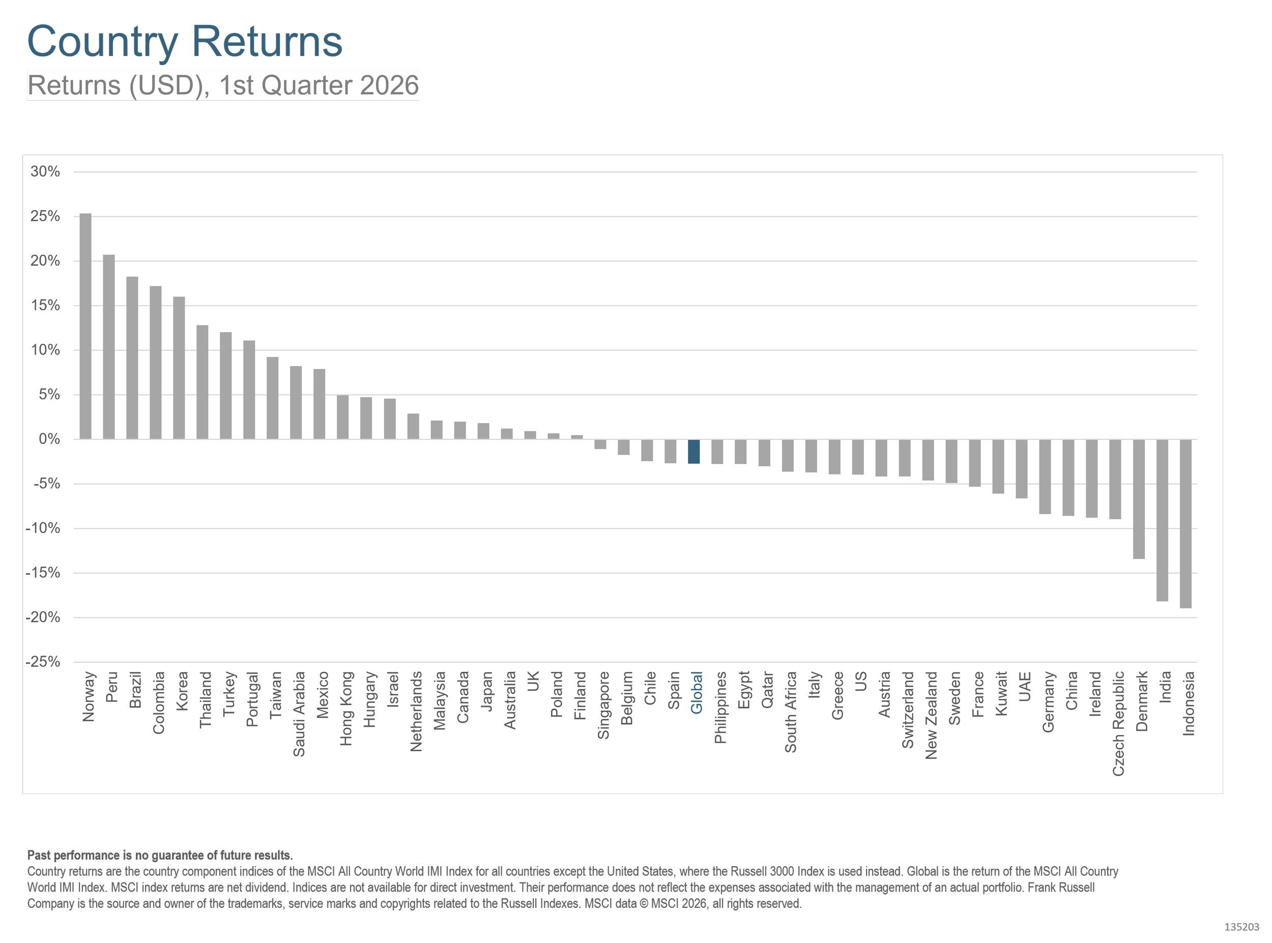Country returns were widely dispersed in Q1 2026, reinforcing the case for broad global diversification rather than concentrated country bets.