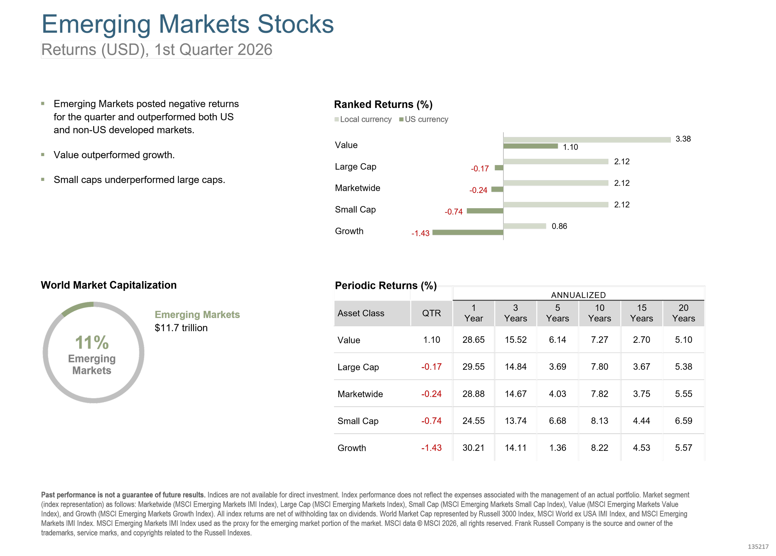 Emerging markets were slightly negative in Q1 2026, but they still outperformed both the US and developed international markets. Value held up better than growth.