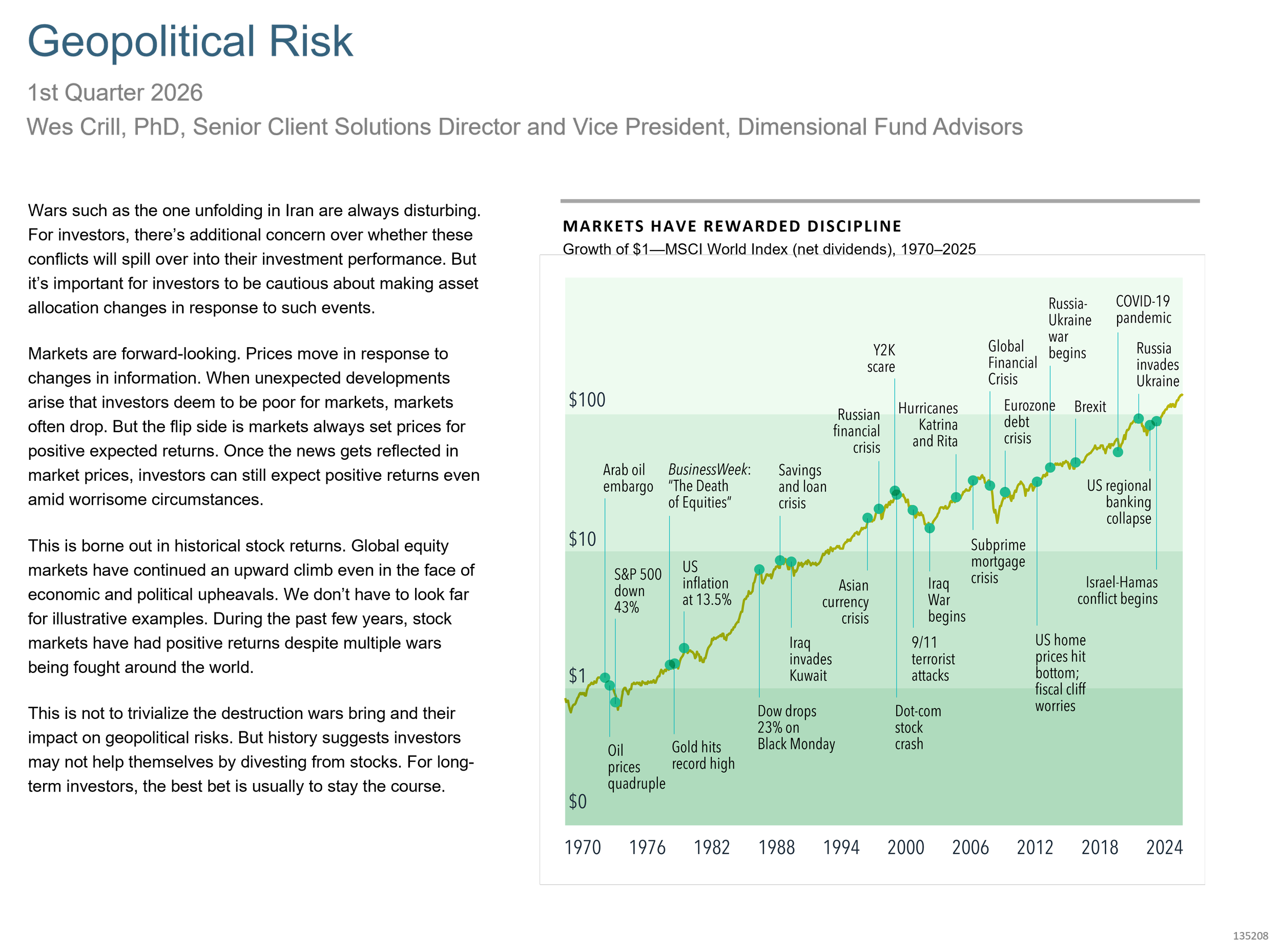 Geopolitical risk can be unsettling, but history suggests that investors typically benefit more from maintaining discipline than from altering allocations based on current events.